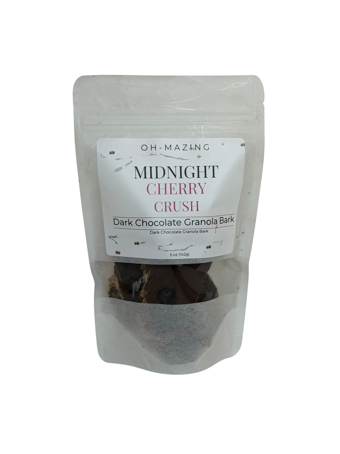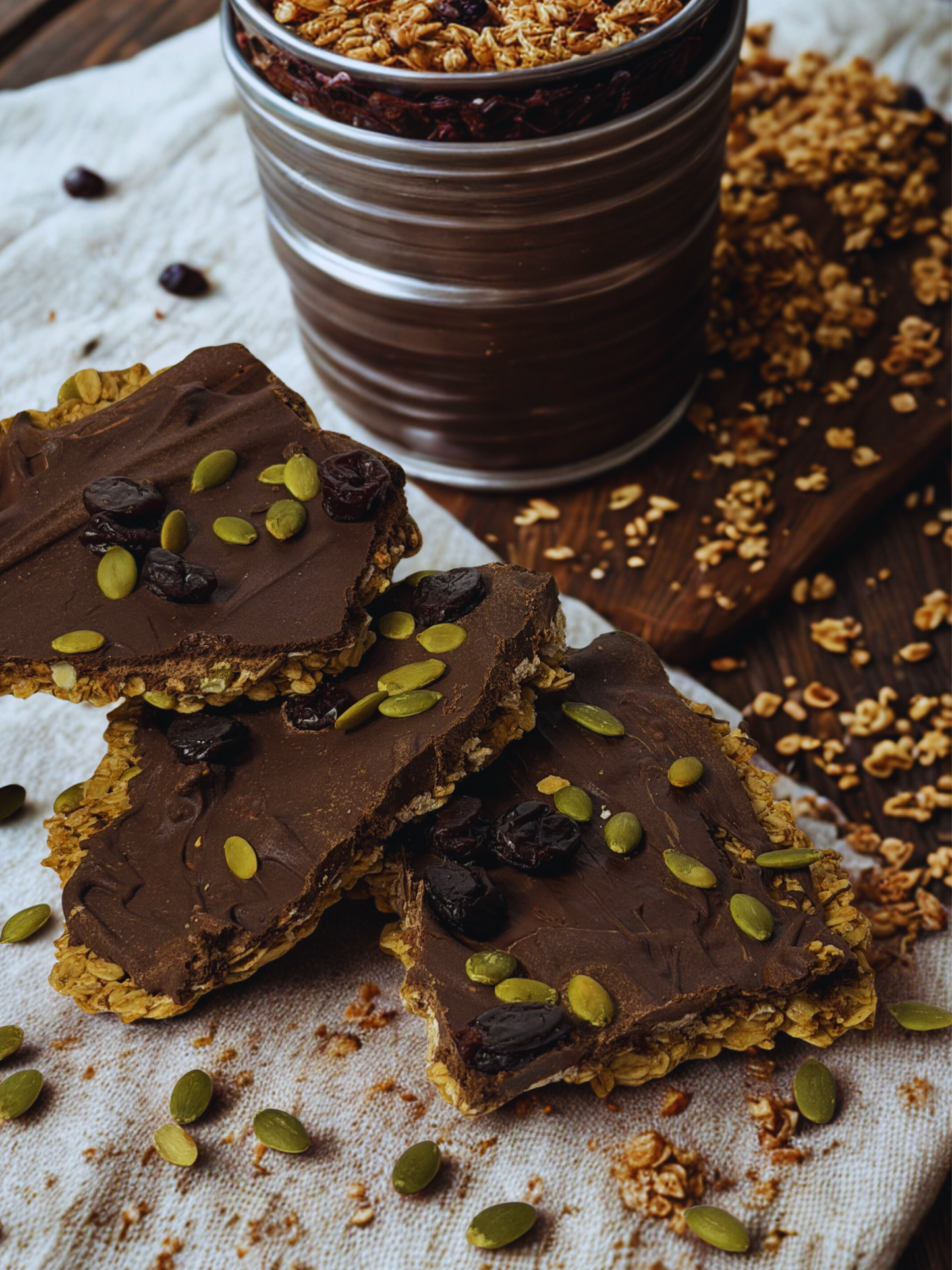 A rich, crunchy mix of golden-baked granola layered with smooth chocolate, topped with tart cherries and roasted pepitas for the perfect balance of sweet, tangy, and nutty flavors.